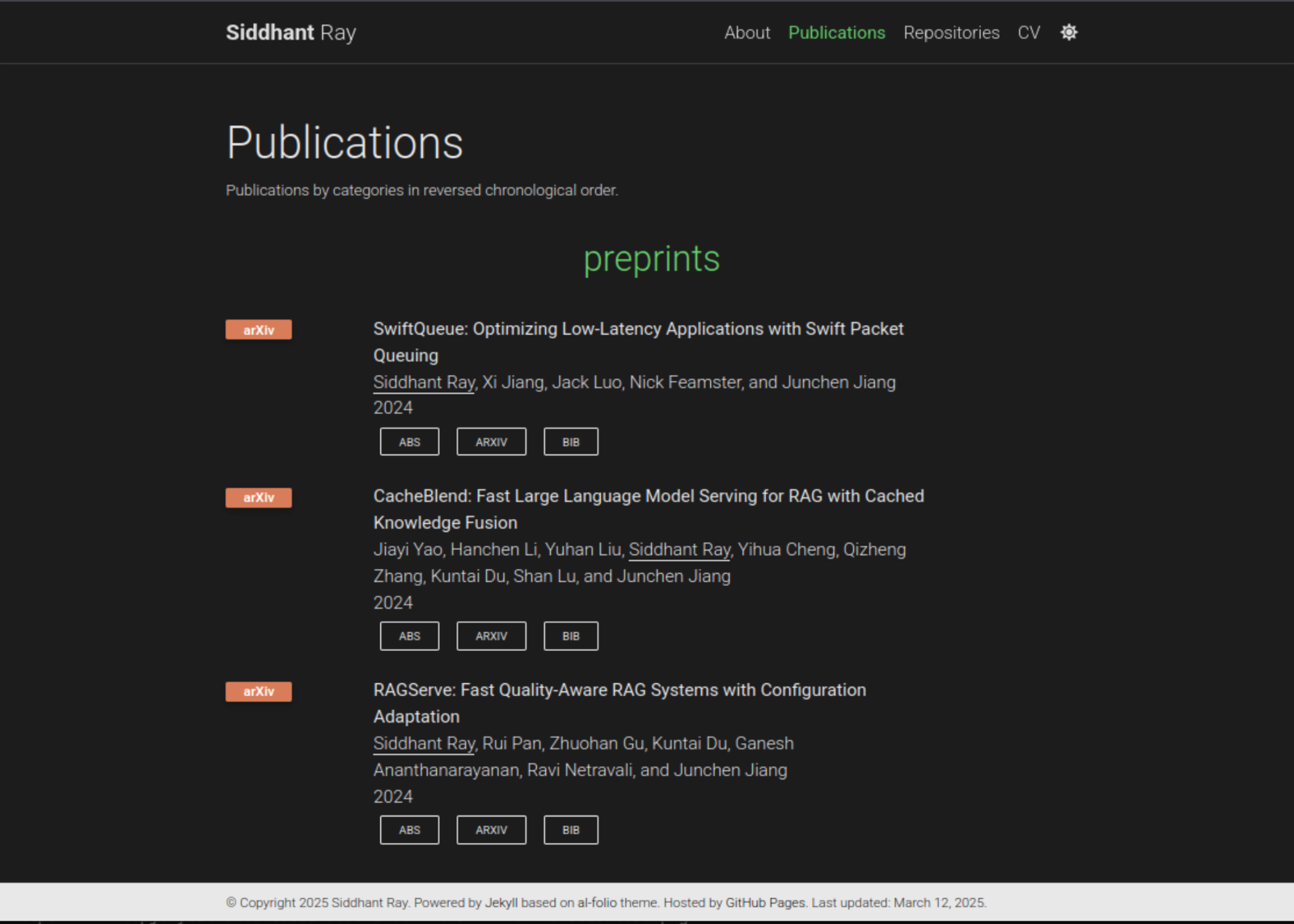 My Portfolio Download Live Demo Share it My Portfolio, a simple, clean, and responsive Jekyll theme for academics. If you like the theme, give it a star! This repository is based of al-folio with some cool modifications. Lighthouse PageSpeed Insights Table of contents Lighthouse PageSpeed Insights About Source Code License: MIT Published: Mar 12, 2025 Updated: Mar 21, 2025 Author Siddhan Ray Followers Themes My Portfolio (self) Previous Theme Next theme Please enable JavaScript to view the comments powered by Disqus.